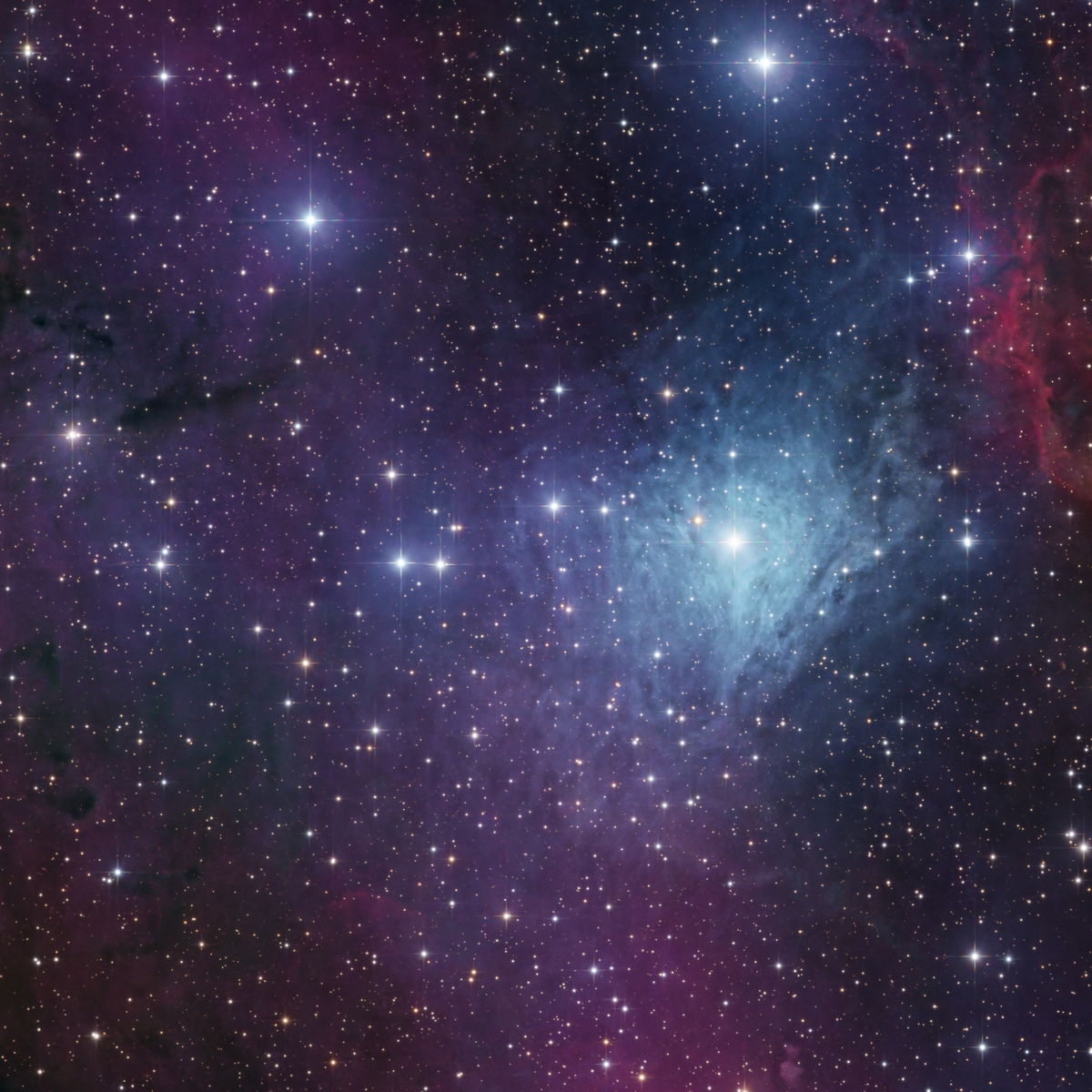 Der Reflexionsnebel IC 444 zeigt eine unregelmäßige, leicht fächerförmige Staubverteilung mit schwachem Helligkeitsgradienten und eingebetteten dünkleren Straubstrukturen. Diese werden jedoch vom hellen. blauen Licht überstrahlt.