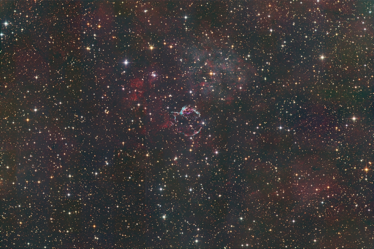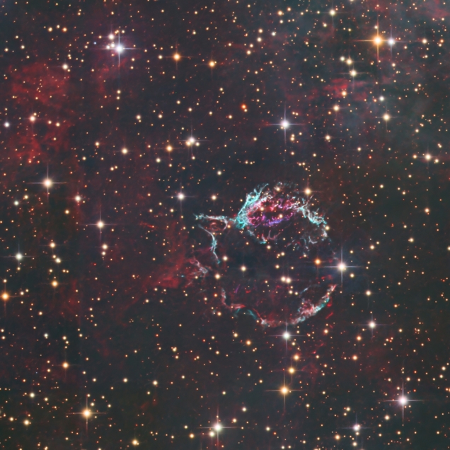 Mario Weigand: "Im Radiobereich ist es das hellste Objekt neben der Sonne. Im optischen aber eine lichtschwache Herausforderung: der Supernova-Überrest Cassiopeia A. Im 17. Jahrhunder kollabierte dort ein massereicher Stern, seitdem expandierte der Überrest der daraus resultierenden Supernova und bildet heute eine rund 3.5' große Blase mit feinen Knoten, die in verschiedenen Linien leuchten. [1] "astronomie - DAS MAGAZIN , Jänner/Februar 2023"