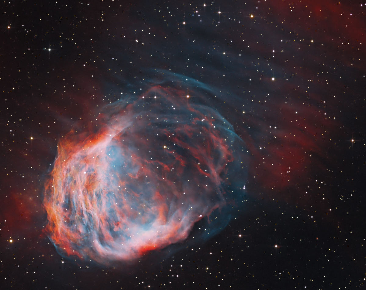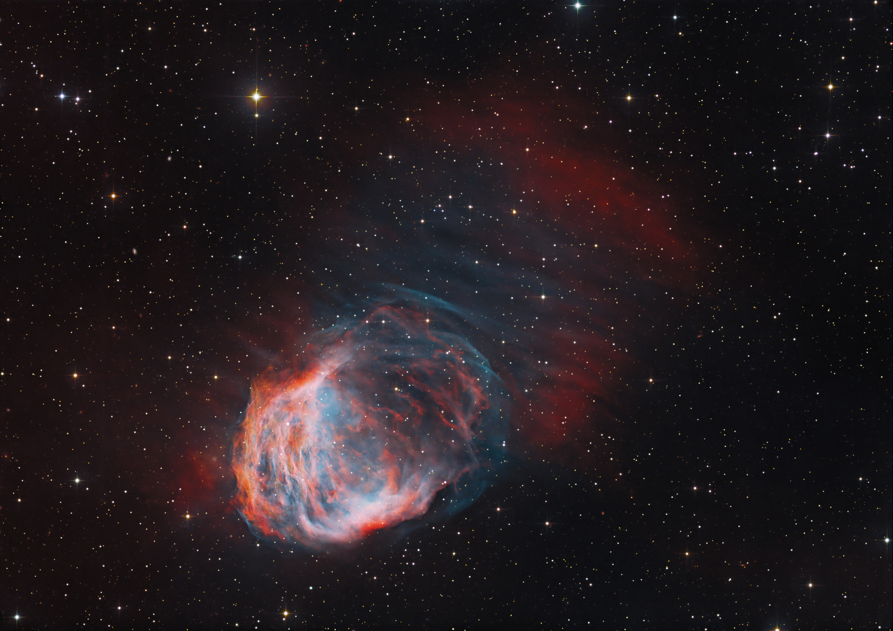 Abell 21, auch bekannt als Medusanebel oder Sharpless 2-274, ist ein großer Planetarischer Nebel im Sternbild Zwillinge. Dieser uralte Nebel erstreckt sich über etwa vier Lichtjahre und liegt etwa 1.500 Lichtjahre von der Erde entfernt. Benannt nach seiner Ähnlichkeit mit der schlangenhaarigen Gorgone der griechischen Mythologie, stellt der Medusanebel ein faszinierendes Spätstadium der Sternentwicklung dar.