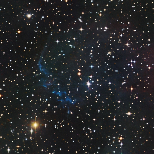 Alves 2 ist ein 2013 identifiziertes diffuses Objekt im Sternbild Auriga. Die dargestellte Aufnahme basiert auf einer HOO-Schmalbandkomposition, ergänzt durch RGB-Daten zur Darstellung der Sterne und extragalaktischen Hintergrundobjekte.
