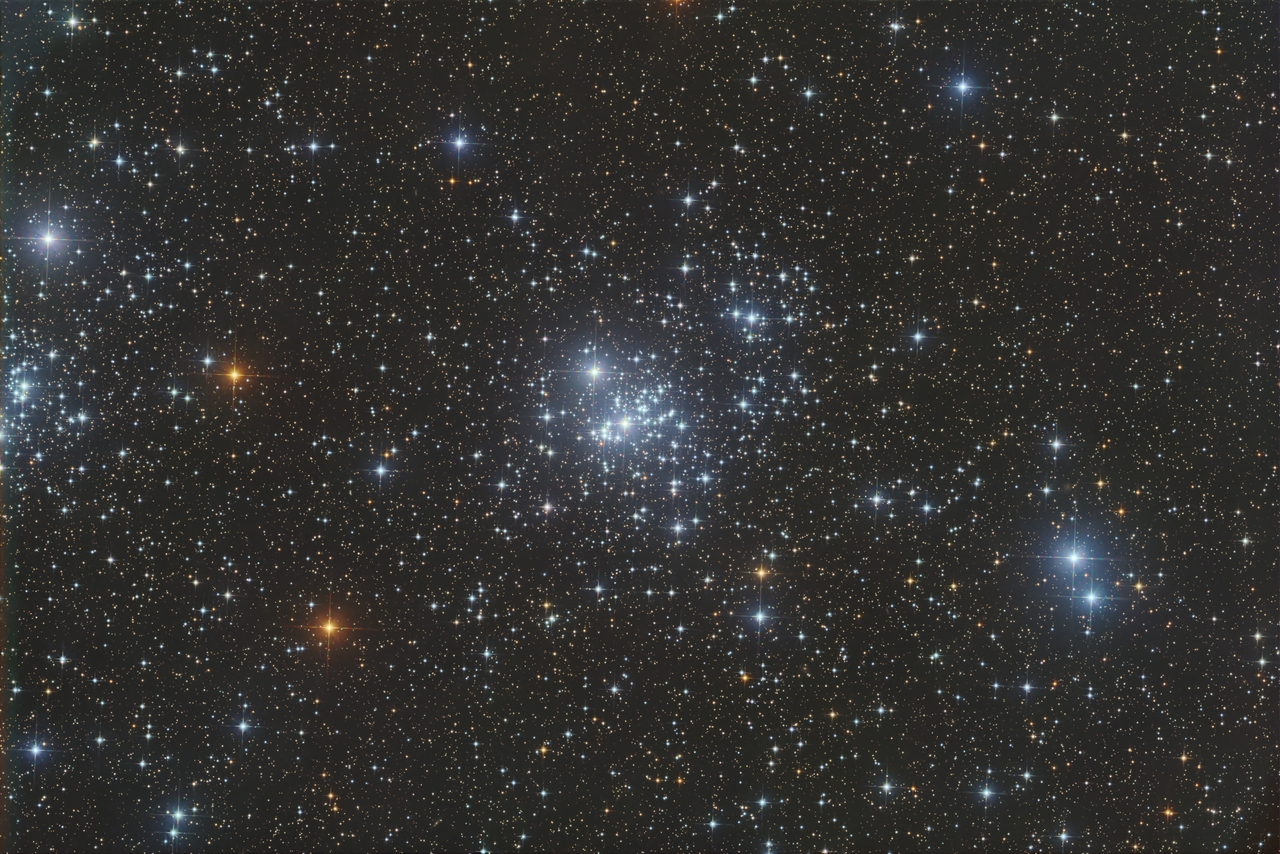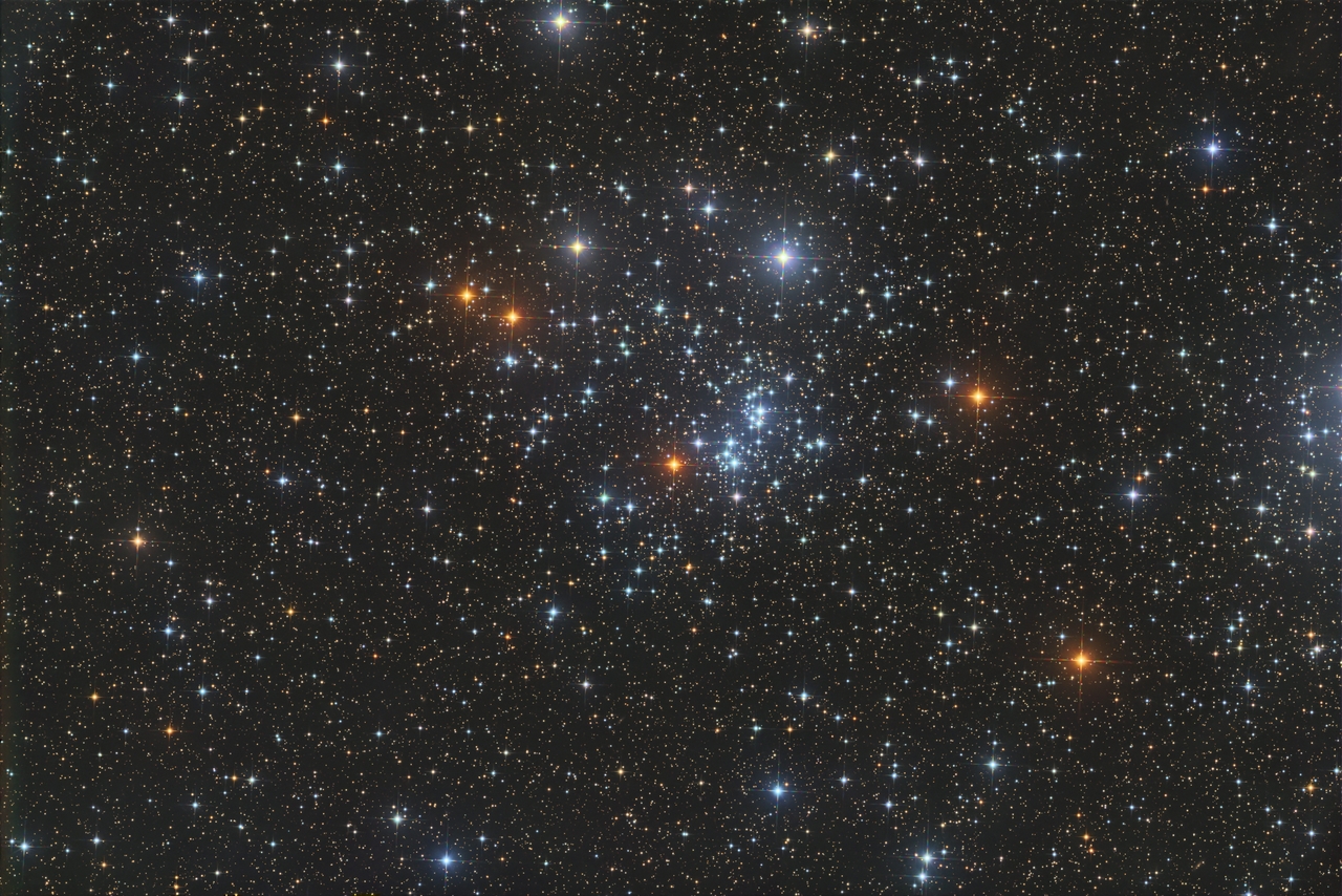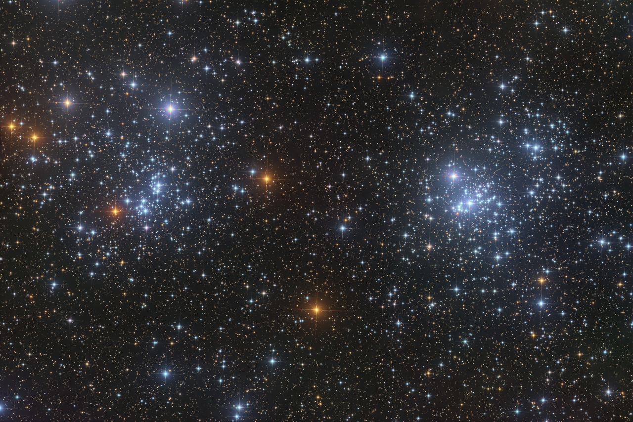 Der Doppelsternhaufen im Perseus, bestehend aus NGC 869 und NGC 884, ist eines der schönsten Fernglas-Objekte am Nordhimmel. Beide offenen Sternhaufen liegen scheinbar dicht beieinander und sind bereits mit bloßem Auge als „nebliger Fleck“ sichtbar.