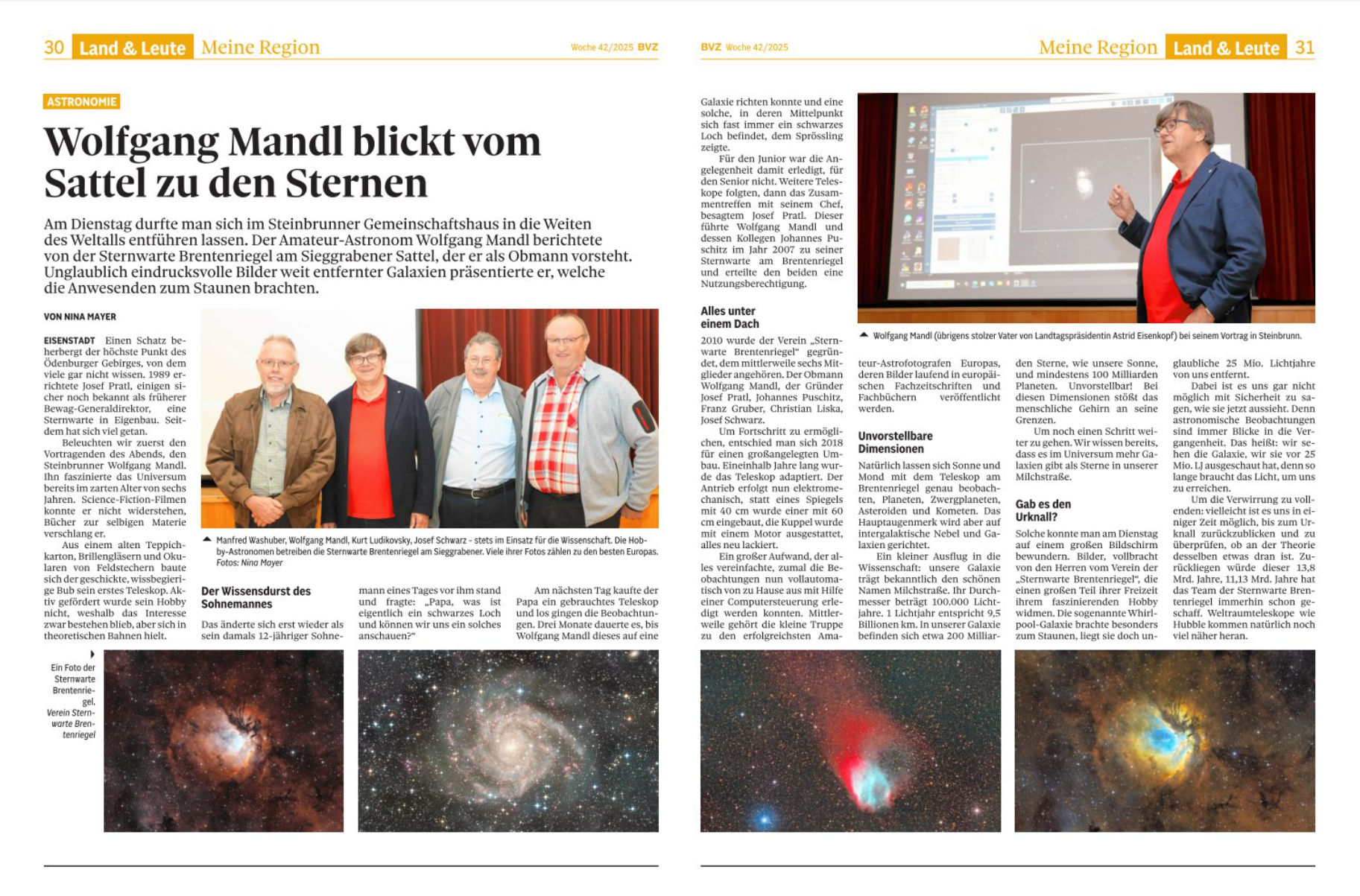 Der Vorstand des einladenden Vereines KuBS Kultur und Bildung Steinbrunn bedankt sich bei den 35 interessierten Gästen und dem motvierten Vortragenden Herrn DI Wolfgang Mandl, Obmann des Vereins Sternwarte Brentenriegel für den informativen Abend.